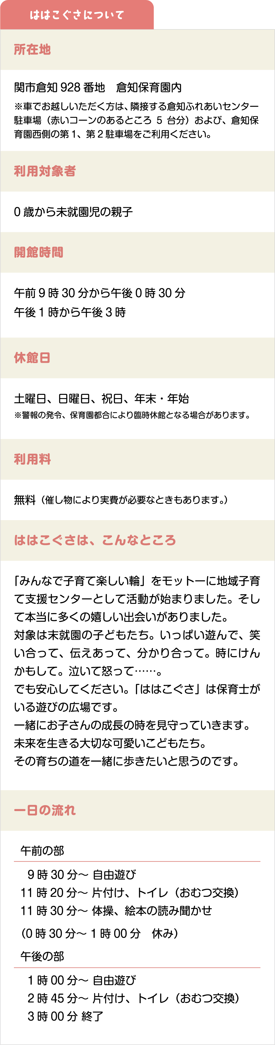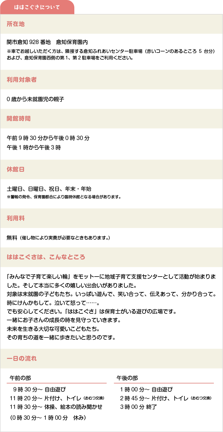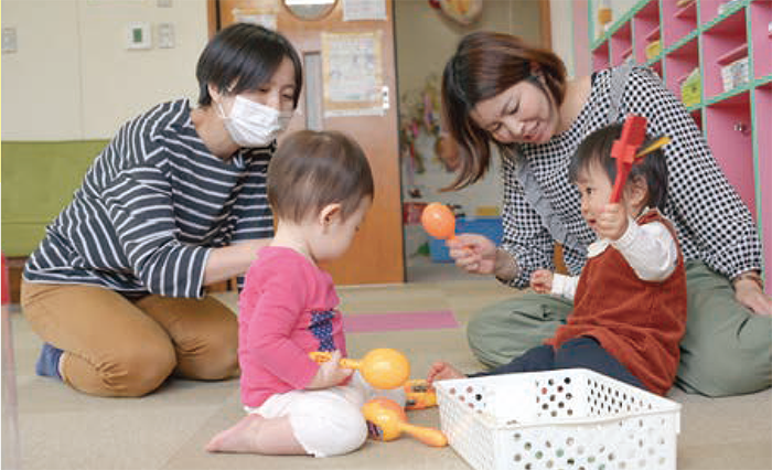 年齢別に分かれて、スキンシップ遊び・手遊びを中心に親子で楽しみます。1年を通して友達づくりや他のお母さんとの子育て情報交換をしてもらうためにクラスをわけています(くま教室:2歳児・うさぎ広場:1歳児)。年齢についてはお問い合わせください。
